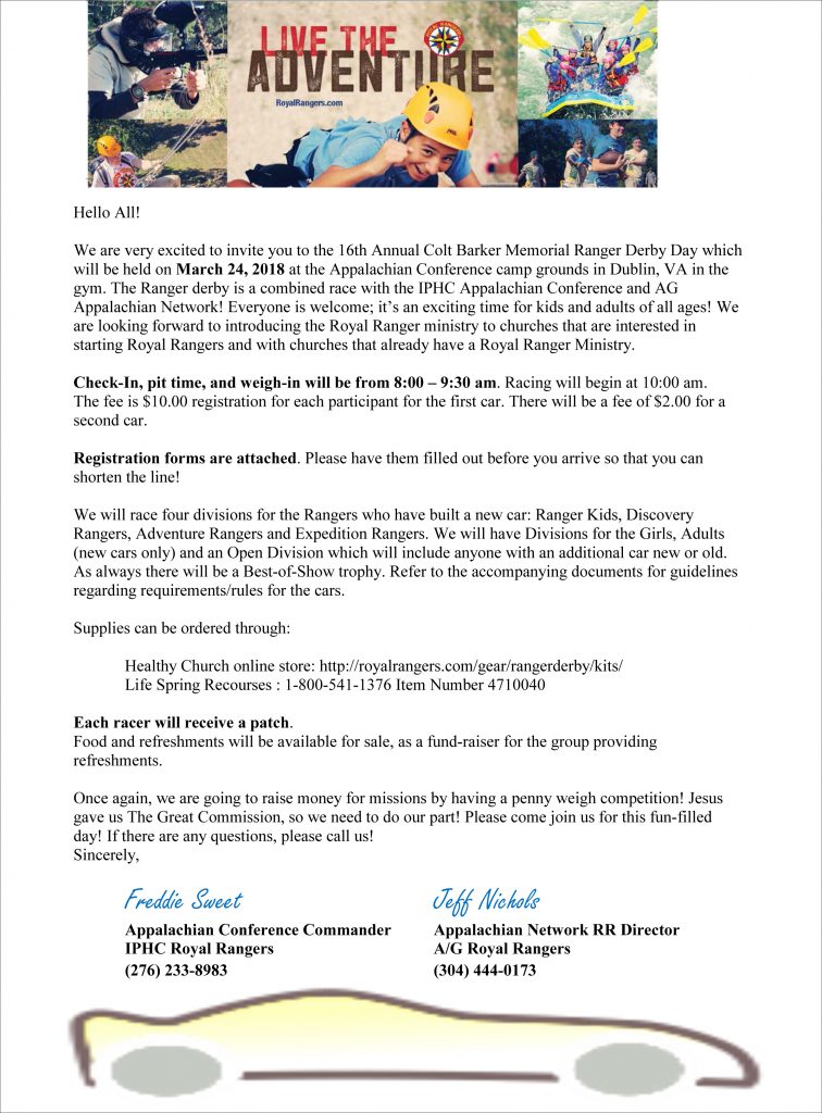 We are very excited to invite you to the 16th Annual Colt Barker Memorial Ranger Derby Day which will be held on April 7, 2018 (postponed from March 24, 2018) at the Appalachian Conference camp grounds in Dublin, VA in the gym. The Ranger derby is a combined race with the IPHC Appalachian Conference and AG Appalachian Network! Everyone is welcome; it’s an exciting time for kids and adults of all ages! We are looking forward to introducing the Royal Ranger ministry to churches that are interested in starting Royal Rangers and with churches that already have a Royal Ranger Ministry.