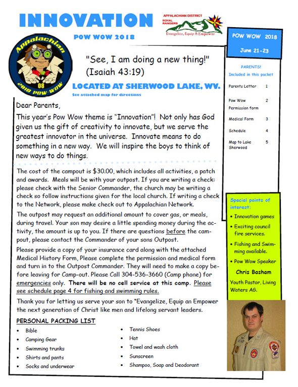 The cost of the campout is $30.00, which includes all activities, a patch and awards. Meals will be with your outpost. If you are writing a check: please check with the Senior Commander, the church may be writing a check so follow instructions given for the local church. If writing a check to the Network, please make check out to Appalachian Network.