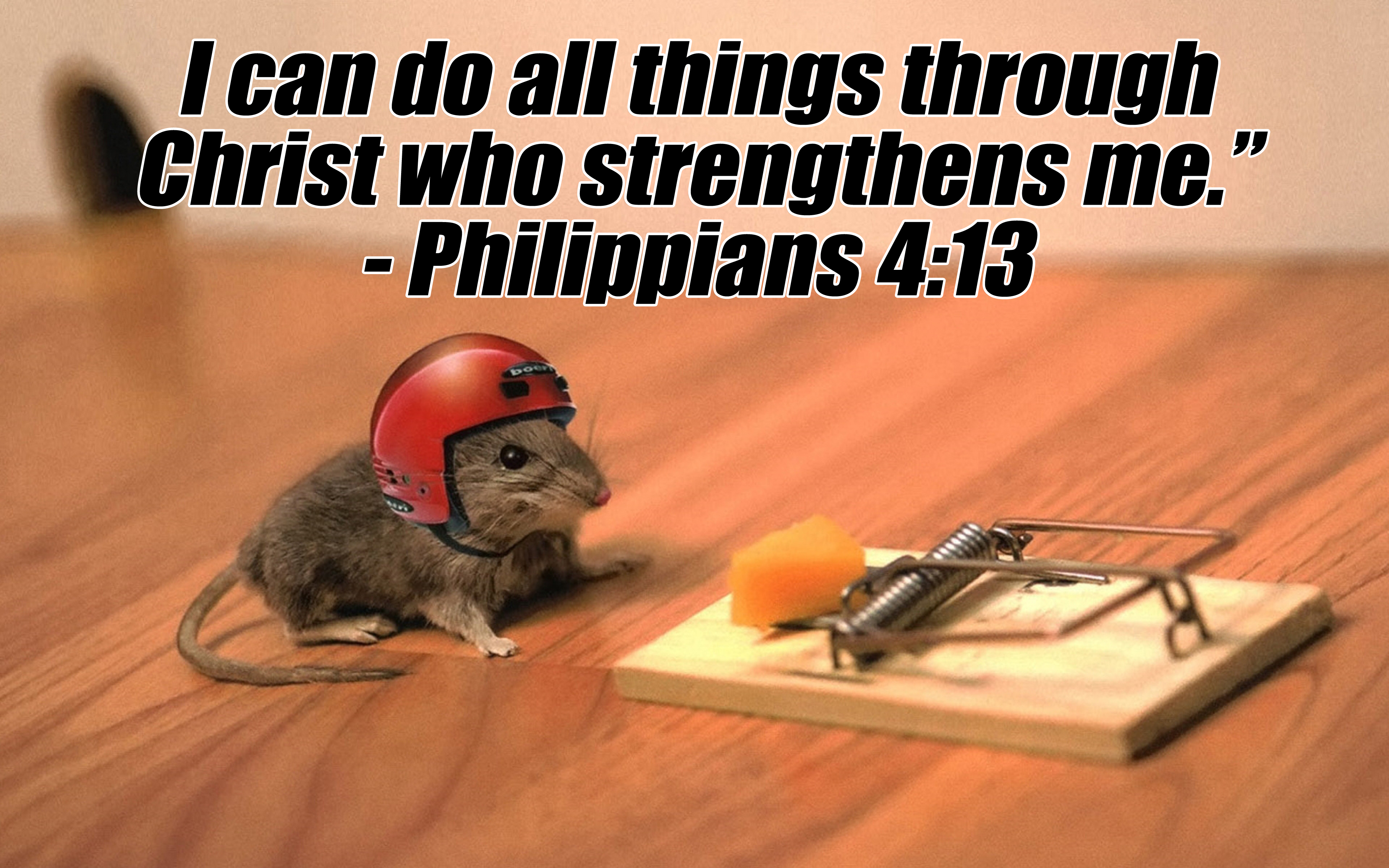 In Philippians 4:13, the Bible says, “I can do all things through Christ who strengthens me.” [Show them the following picture of the mouse wearing a helmet. You can even bring copies to give each child to take with them if you want.] The next time the Devil throws an obstacle in your life and you don’t know if you can overcome it, remember this verse. “I can do all things through Christ who strengthens me.”